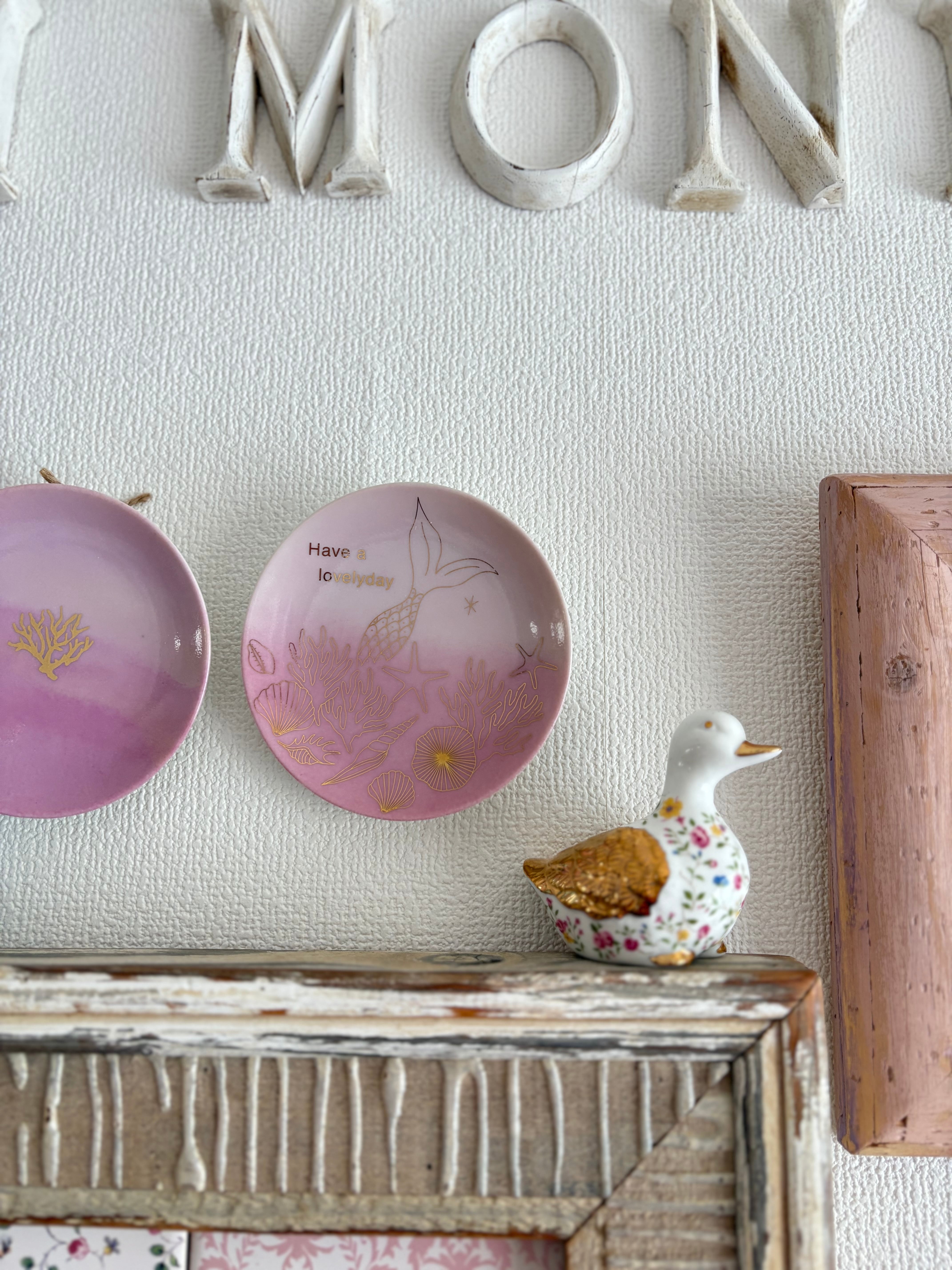 小さなプレートには、貝殻と海で泳ぐ人魚をデザインしました