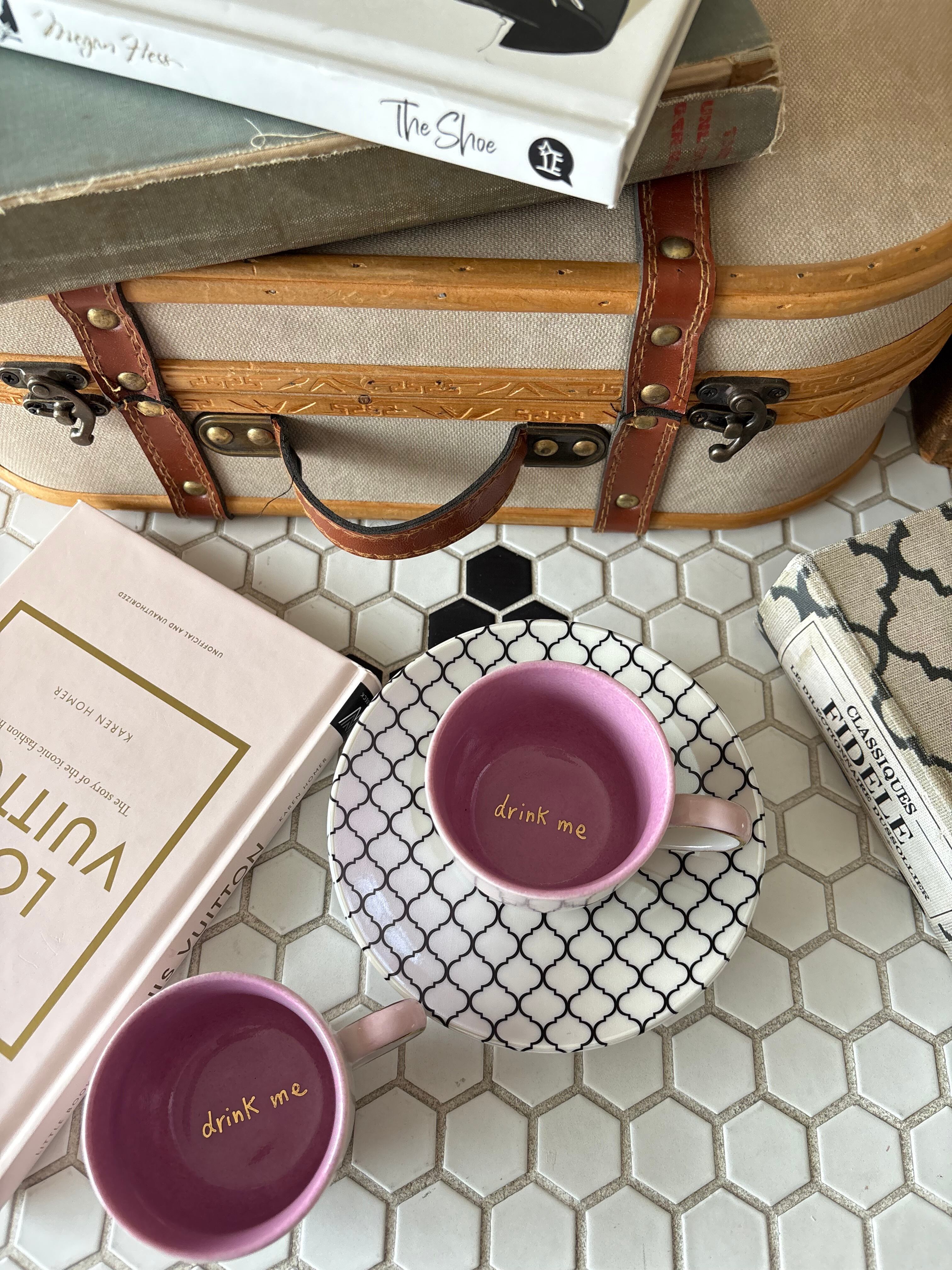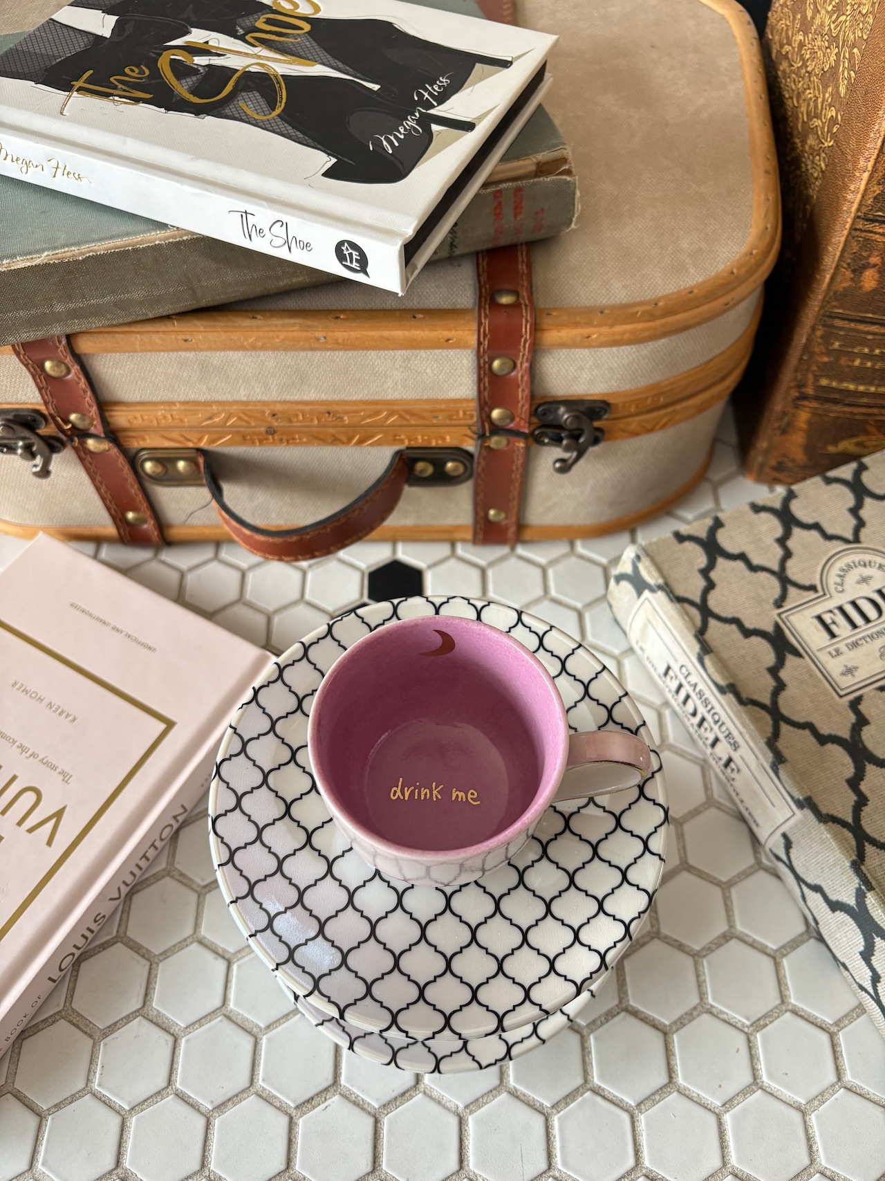 カップの内側は柔らかなピンク色で、見るたびに可愛らしさがあり、ソーサーの大人可愛いモロッカンデザインとぴったり
