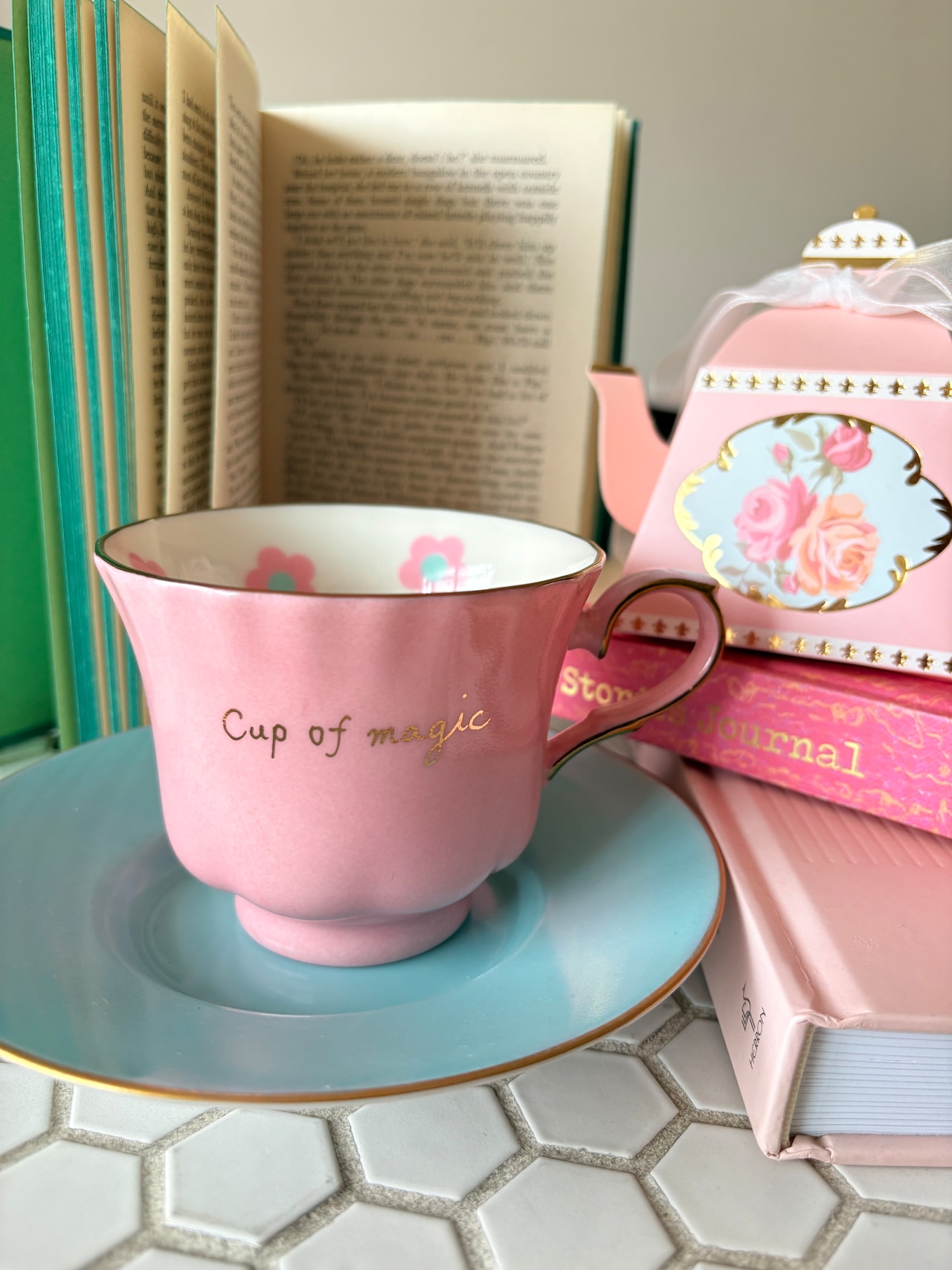 ティファニーブルーカラーで色付けをしたソーサーにピンクのカップの合わせが可愛いセットです♡